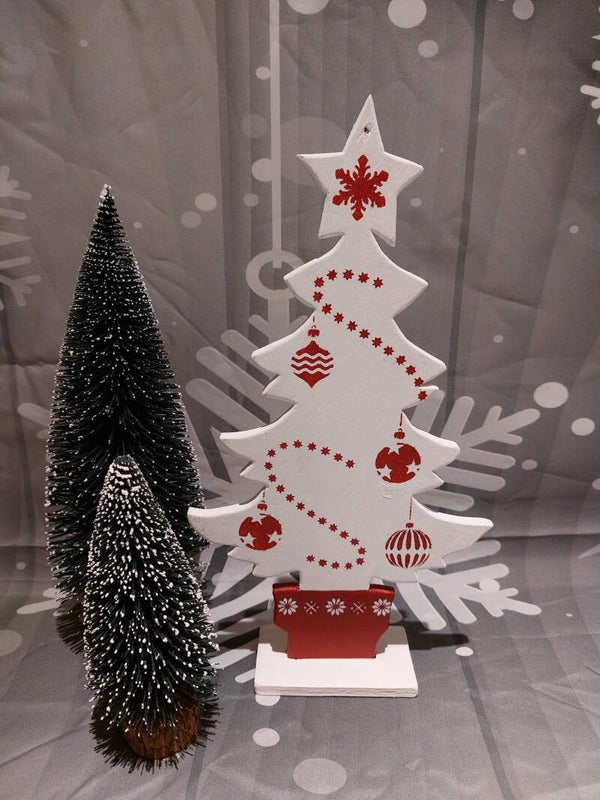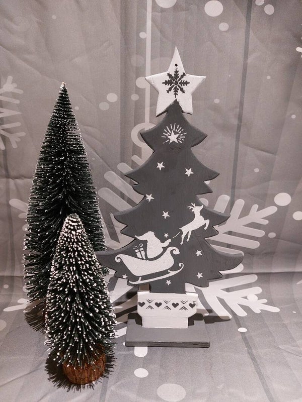 Matière : bois et décoration en peinture sur les deux côté du sapin.
